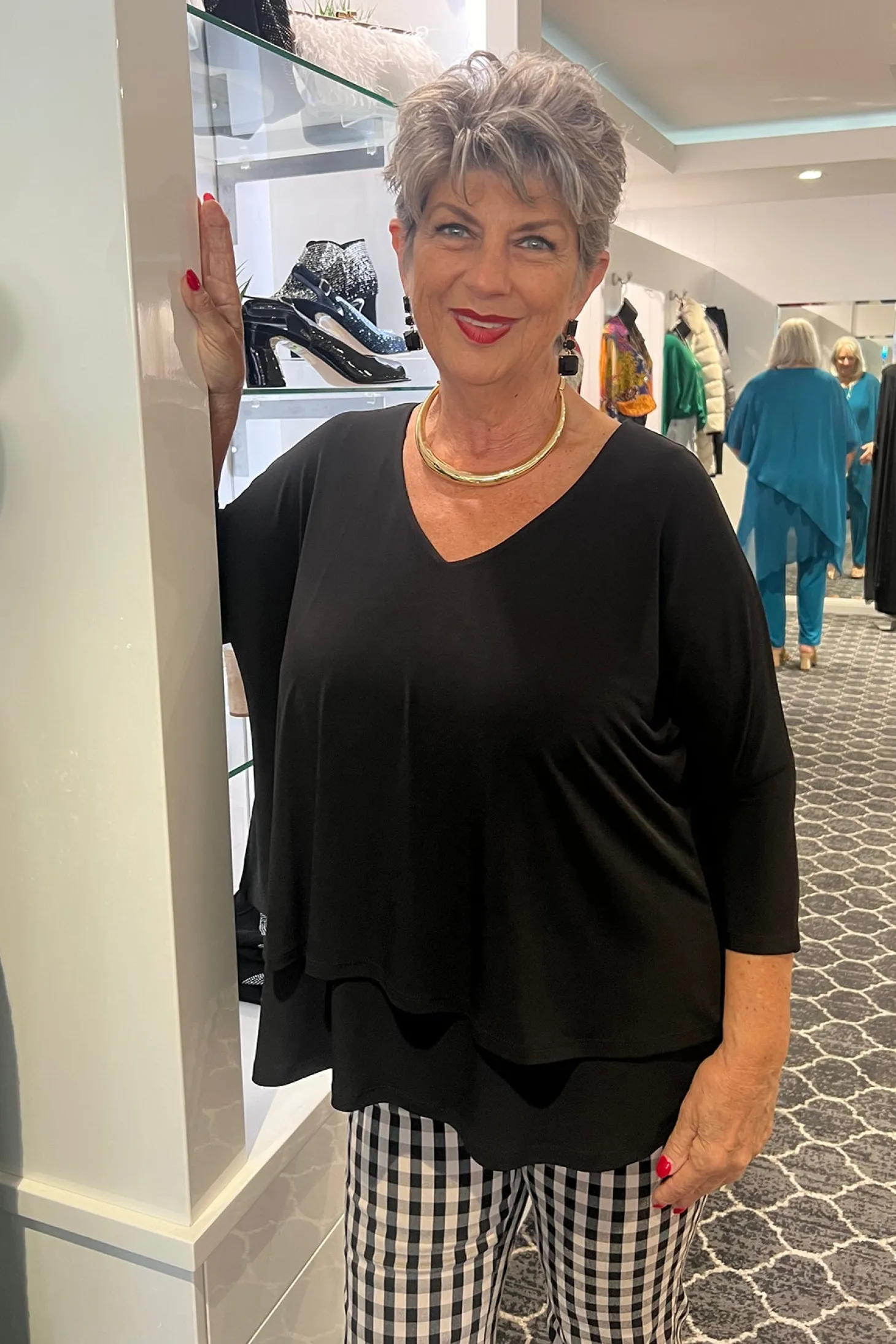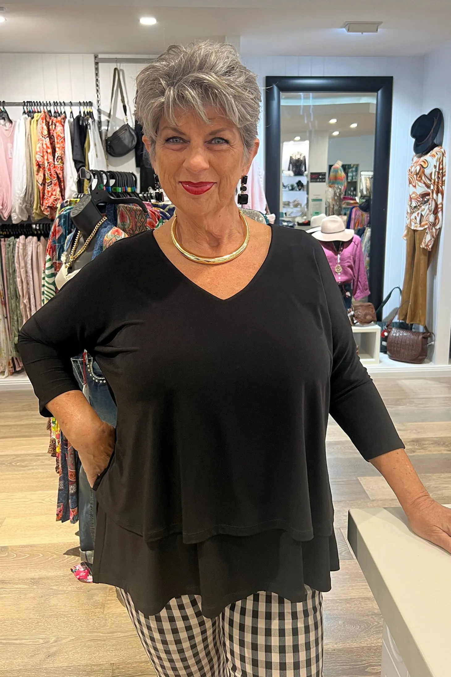 Indulge in the luxurious sophistication of our Quad Layer Tunic. Featuring a flattering 3/4 sleeve and a deep v-neck, this black top is crafted with four layers for added dimension and style. Elevate your wardrobe and embrace the ultimate in fashion and comfort with this exclusive piece.