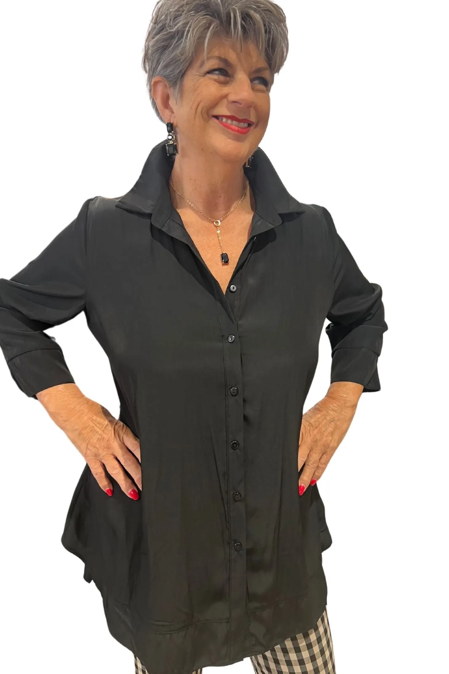 Introducing the Genesis Swing Shirt in Black. This exquisite shirt features a button front and long sleeves, making it versatile for any occasion. Its lightweight fabric provides comfort and elegance, making it a must-have in every wardrobe. Experience luxury and sophistication with Genesis.