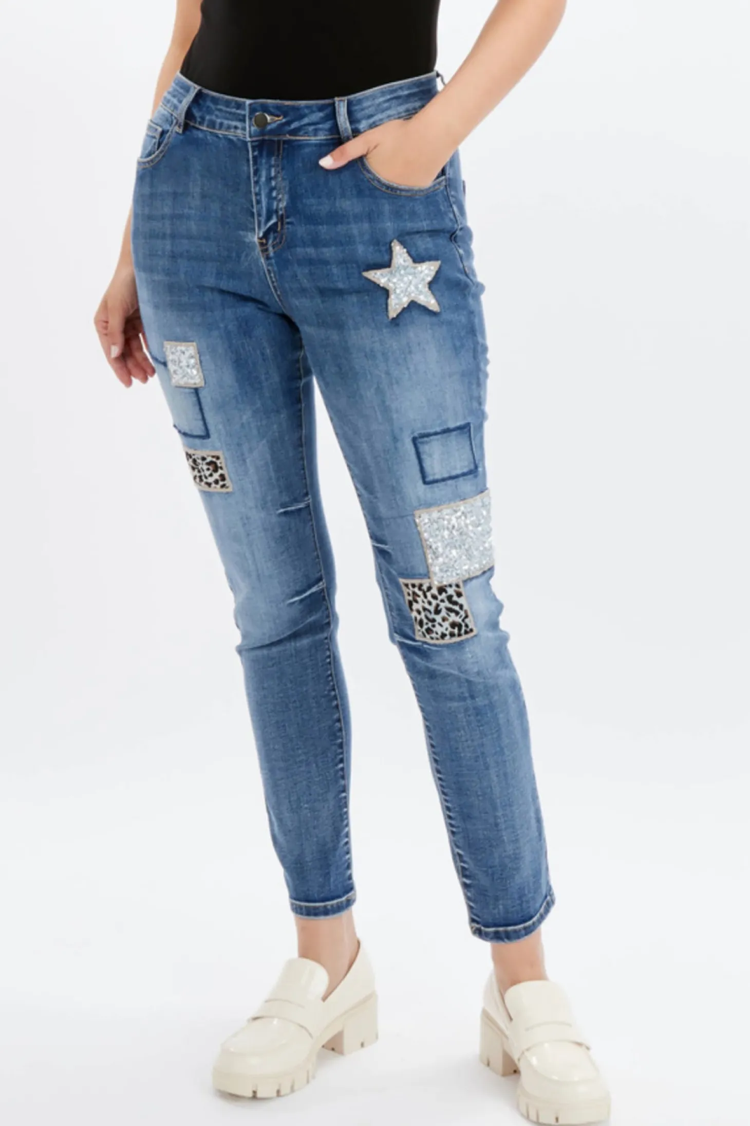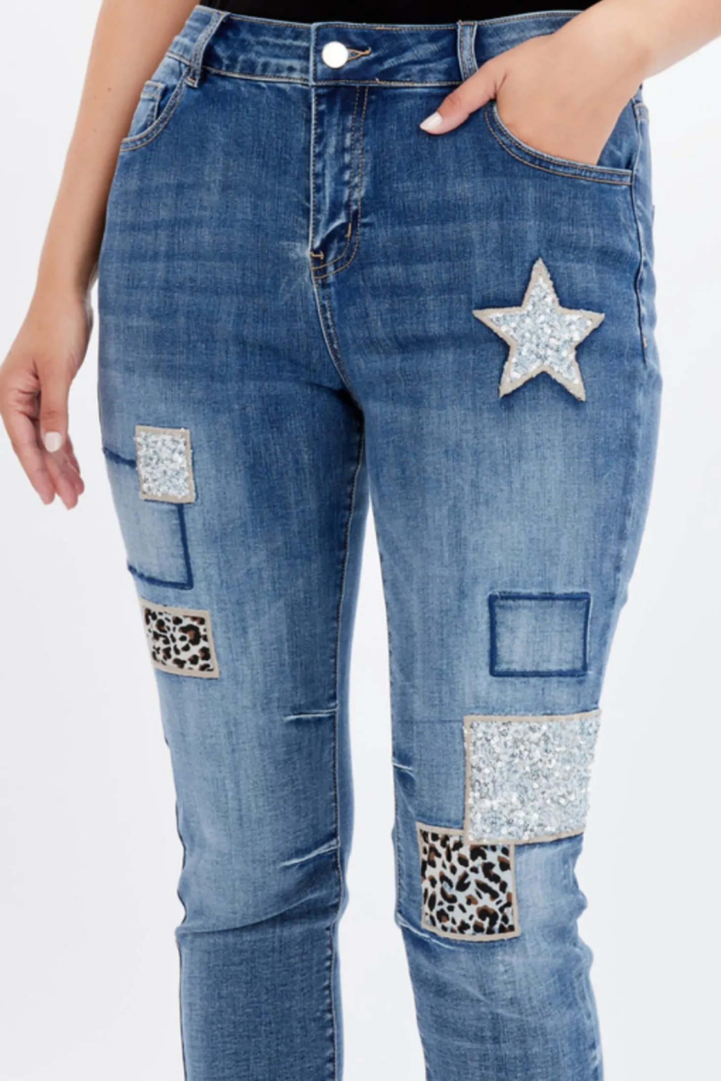 Experience the art of fashion with our Jazzed Up Jeans. Made with high-quality denim, these jeans feature a stunning Sequence Star and animal print patch detail, adding sophistication to your ensemble. Stand out from the crowd and elevate your style with our Denim.