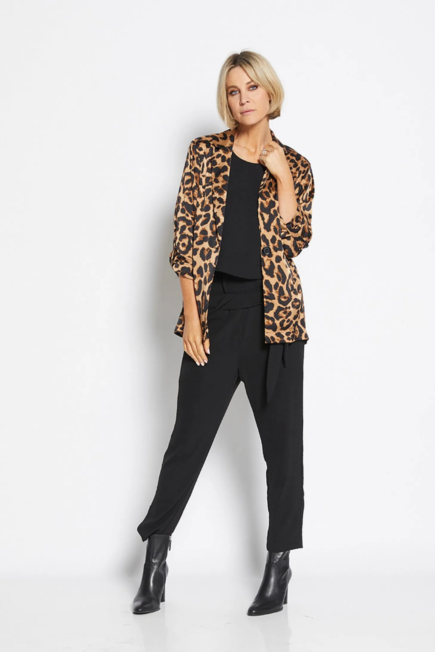 Introducing the Joan Jacket in animal print. Made in Australia, this lightweight jacket features a single button closure for a sophisticated touch. Its animal print adds a touch of glamour and style to any ensemble.