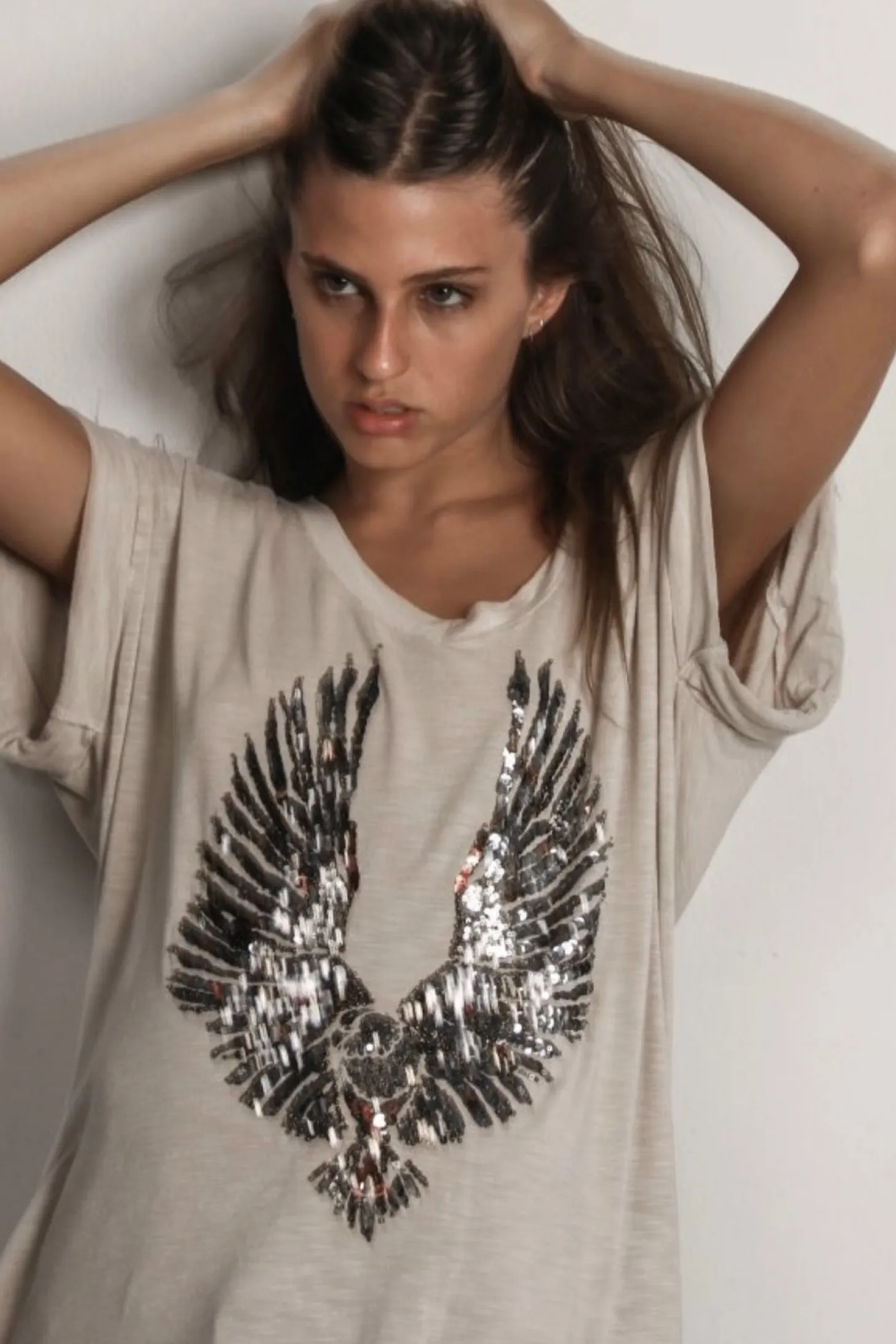 Experience style and comfort with our Kau Tee in Sabia. Expertly crafted with cotton/rayon slub, this oversized short-sleeved T-shirt features raglan sleeves and a rolled hem for a relaxed fit. The signature metal mix sequinned phoenix design adds a touch of glamour to this versatile piece.