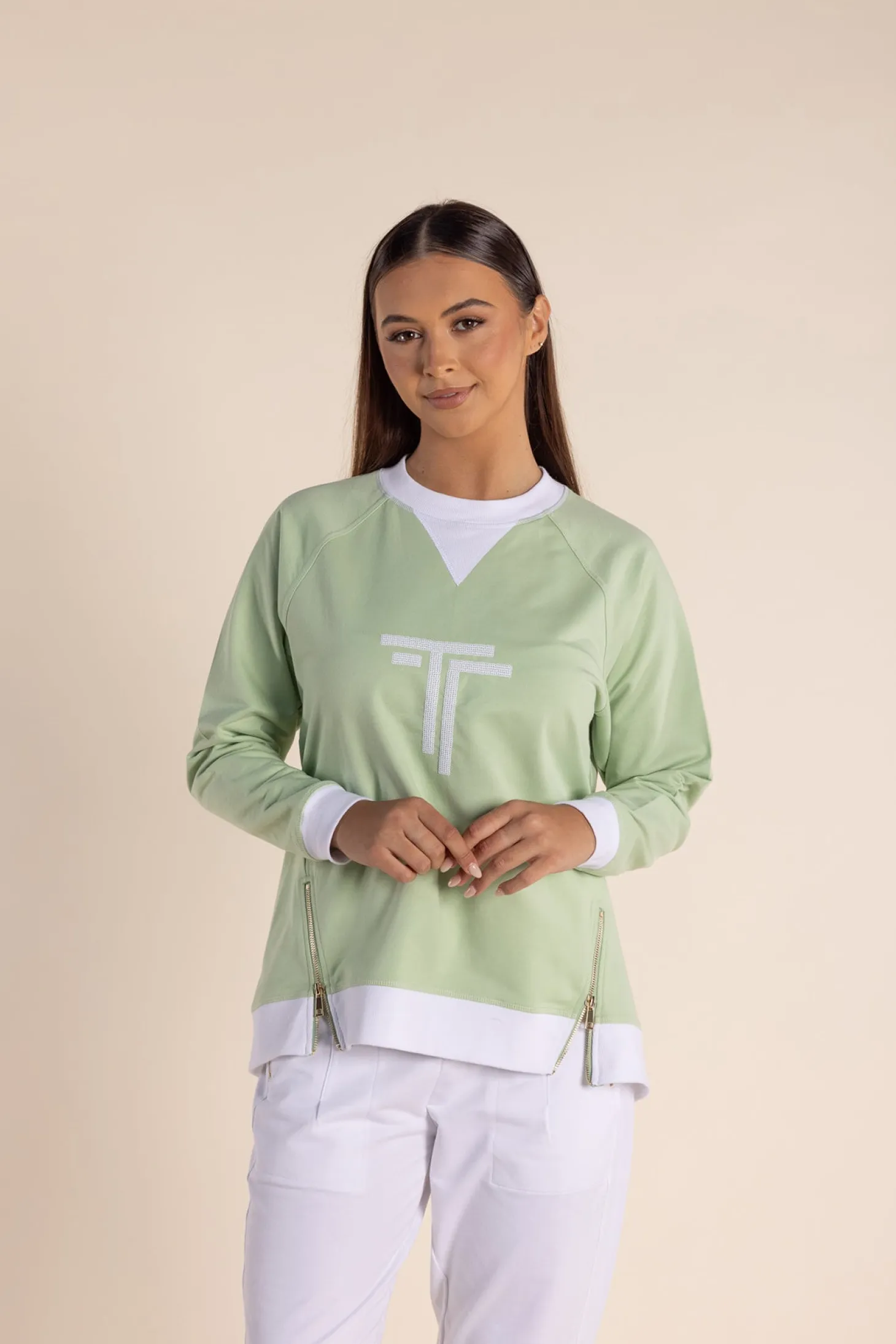 Introducing our Naya Zip Sweat in Soft green & White. Featuring a sequin logo and side zips, this sweatshirt adds glamour and functionality to your wardrobe. With contrast rib detailing, it’s a stylish and versatile piece for any occasion.
