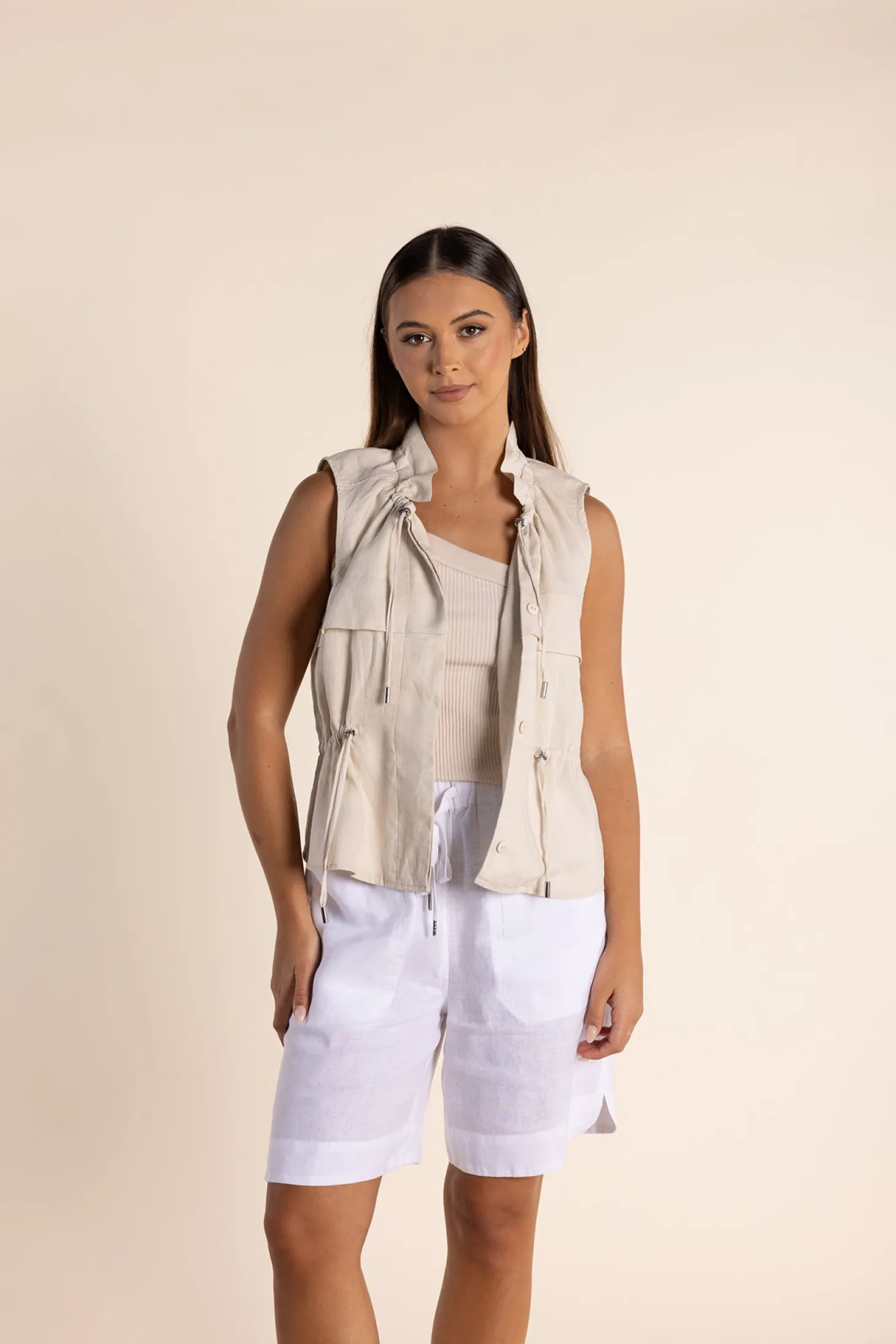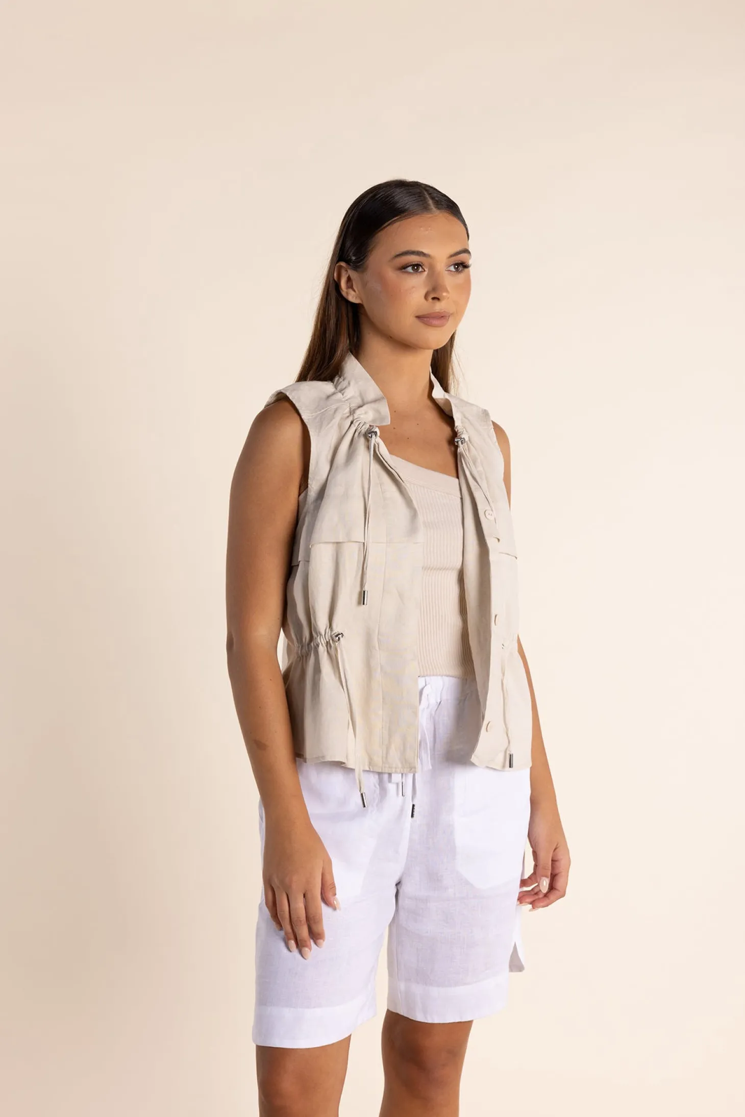 Looking for a vest that’s both stylish and functional? Look no further than the Petra Linen Vest! With a hidden button front and a drawstring waist, this 100% linen vest will keep you looking chic while providing a comfortable fit. Perfect for any occasion, this vest is a must-have addition to your wardrobe.