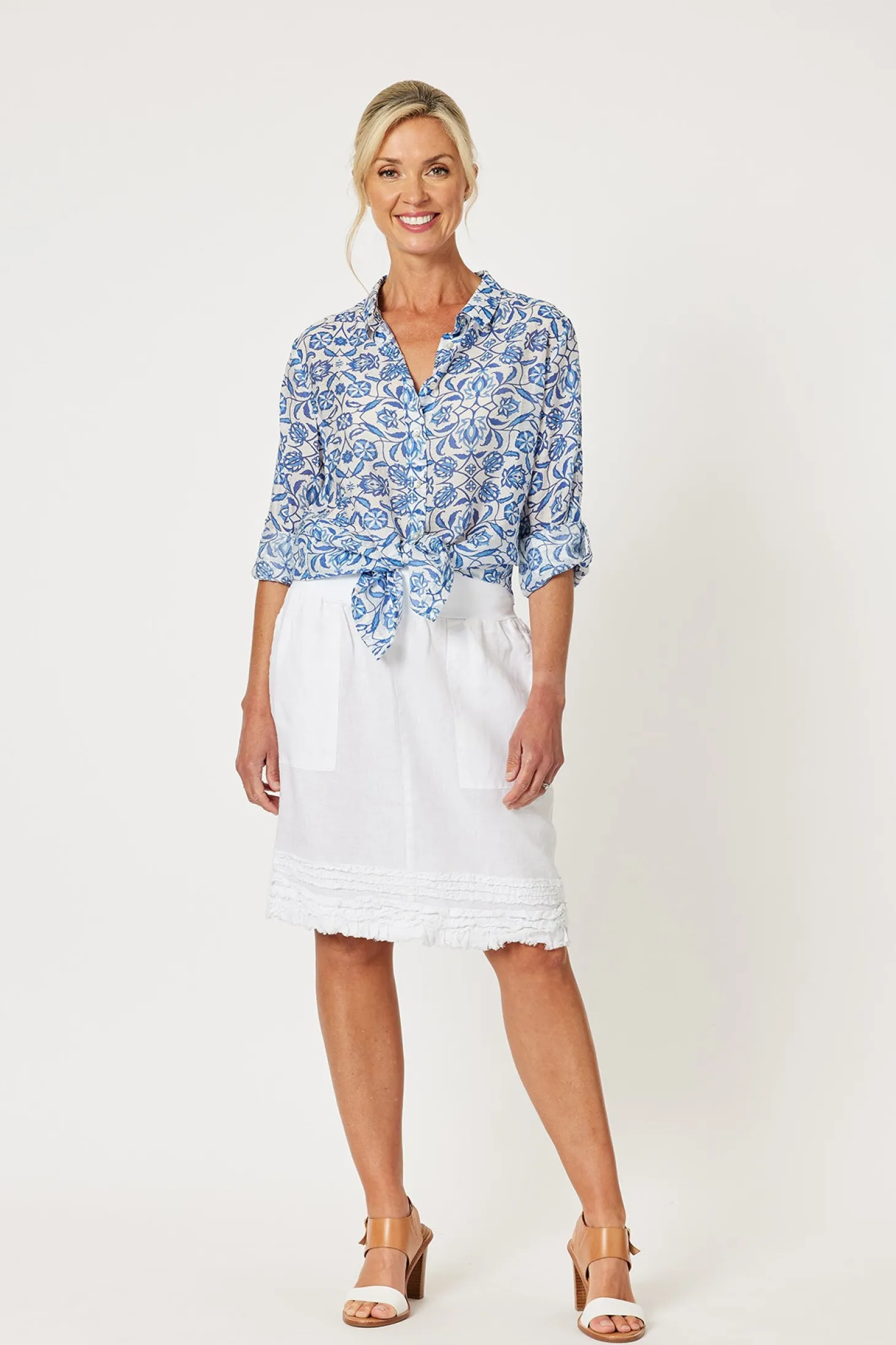 The Ruffle Hem Linen Skirt from Gordon Smith is one of the best selling skirts. Styled in their signature washer finished linen. The skirt is pull on with a soft waistband. Front pockets with stitched pocket bag detail. Back yolk and patch pockets. Raw edge ruffle trim at the hem. Will sit knee length on most.