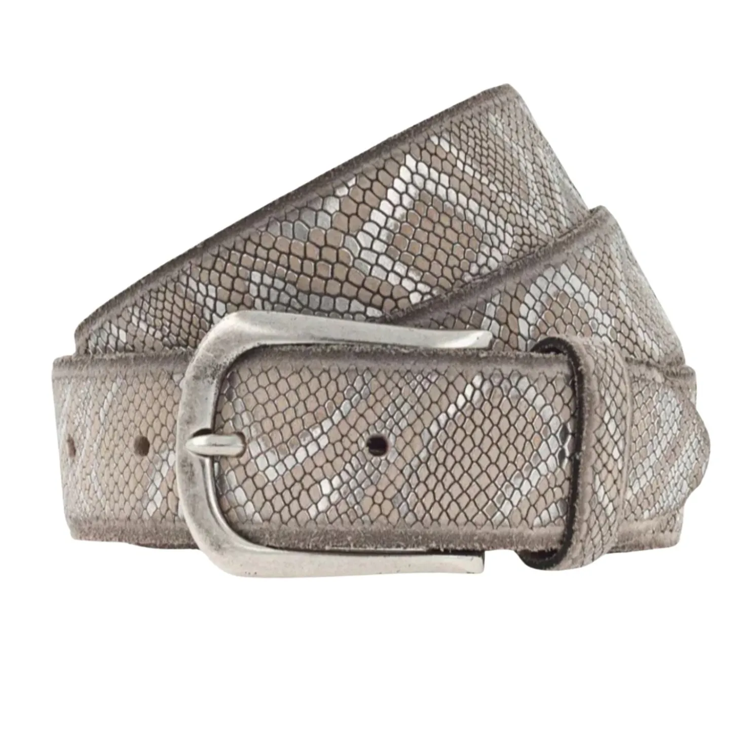 Full grain leather belt with metallic snake embossing. Airbrushed edges with buckle in polished silver.
