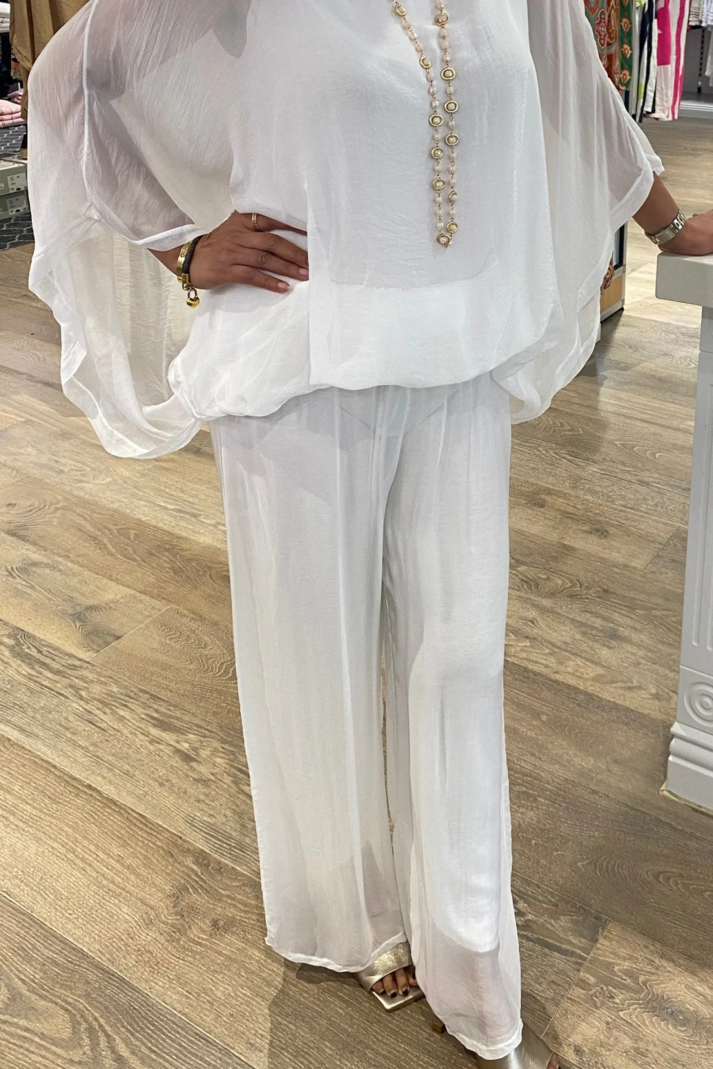 Expertly crafted by Cindy G in Italy, these Silk Viscose Pants fuse elegant style with comfort. The elastic waist and fully lined silk blend provide a relaxed fit, perfect for any occasion. Embrace the beauty of Italian fashion with these wide-leg pants.