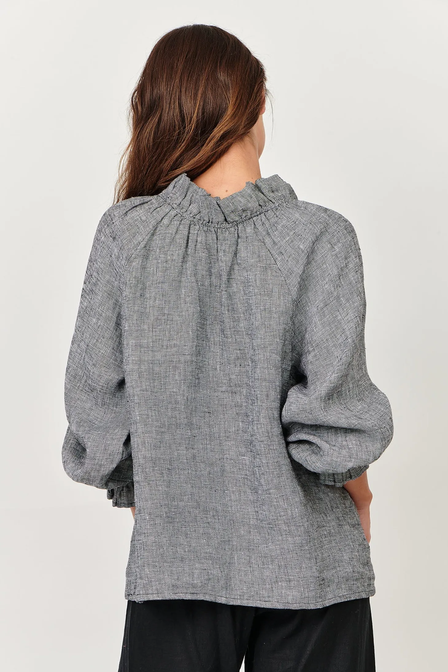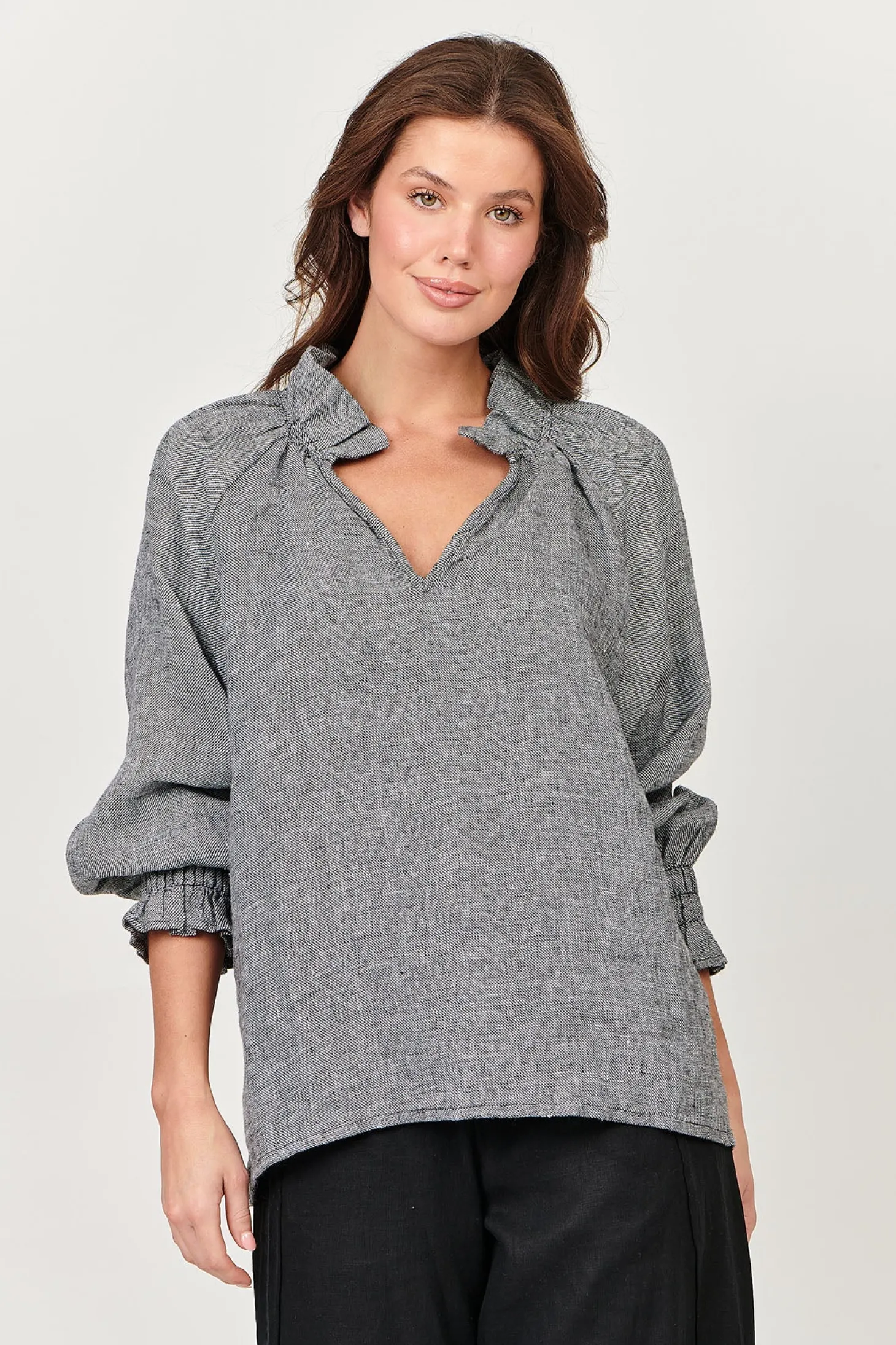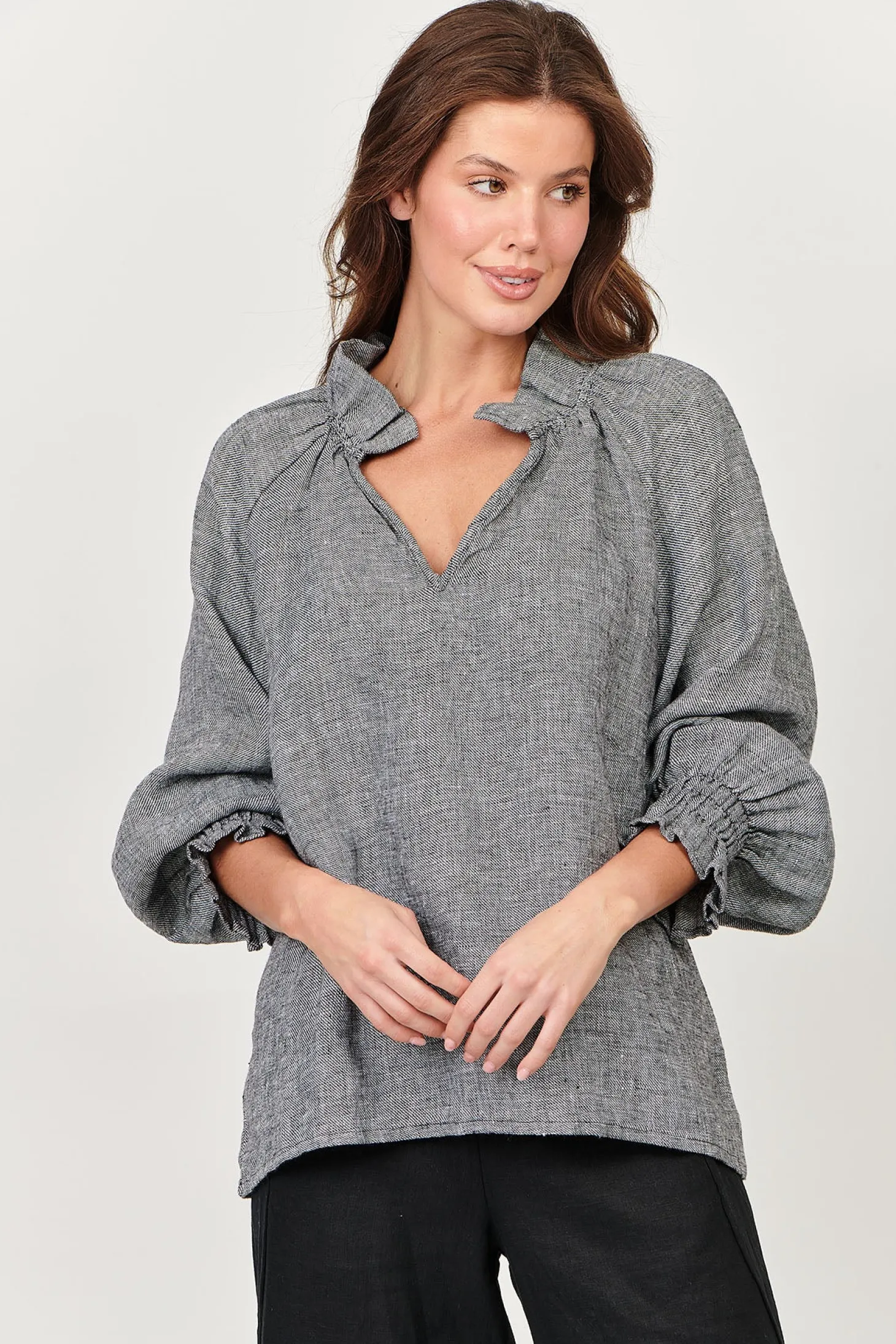 Elevate your wardrobe with our Tulip V-Neck Linen Top in Pepper. Crafted from 100% linen, this top boasts a fluted neck and long sleeves for a sophisticated touch. Perfect for any occasion, this top is a must-have for any fashion-forward individual. This Linen top in the naturals Collection by Olive et Julie is perfect for every day.
