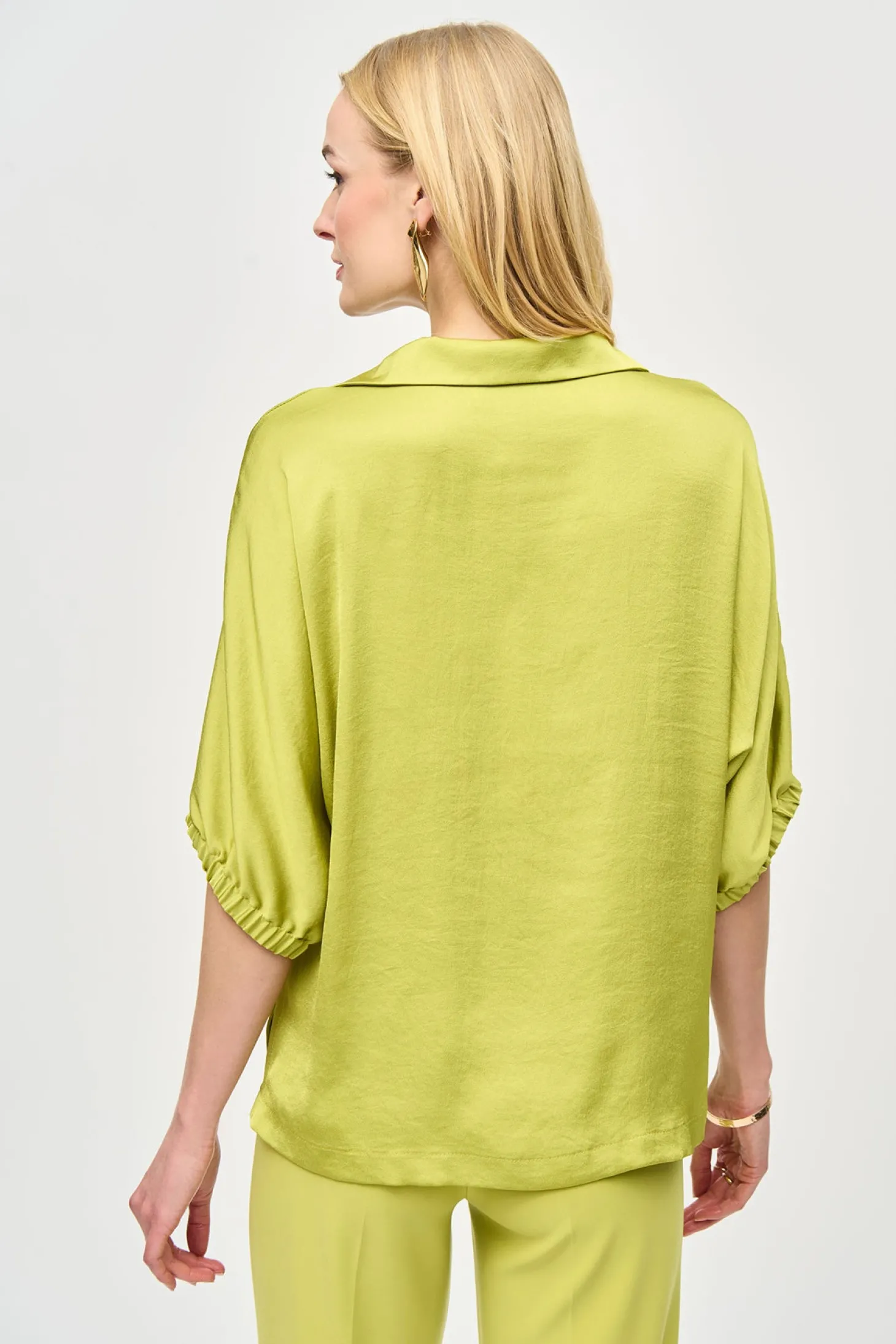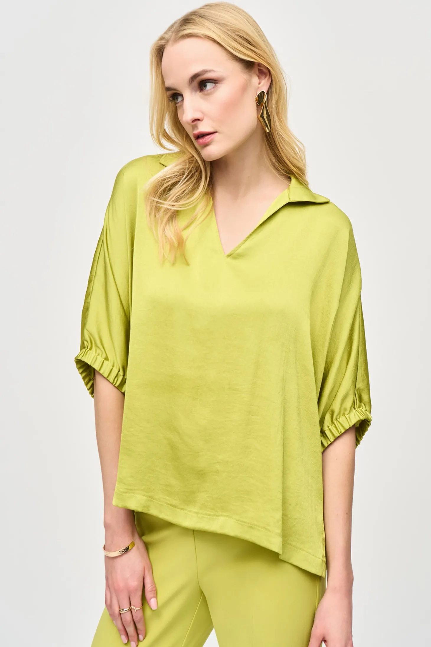 Introducing the Wasabi Boxy Top by Joseph Ribkoff, featuring a stylish V-neck and elegant collar. The soft elastic cuff and 3/4 sleeve provide comfort and sophistication. Elevate your wardrobe with this luxurious top.