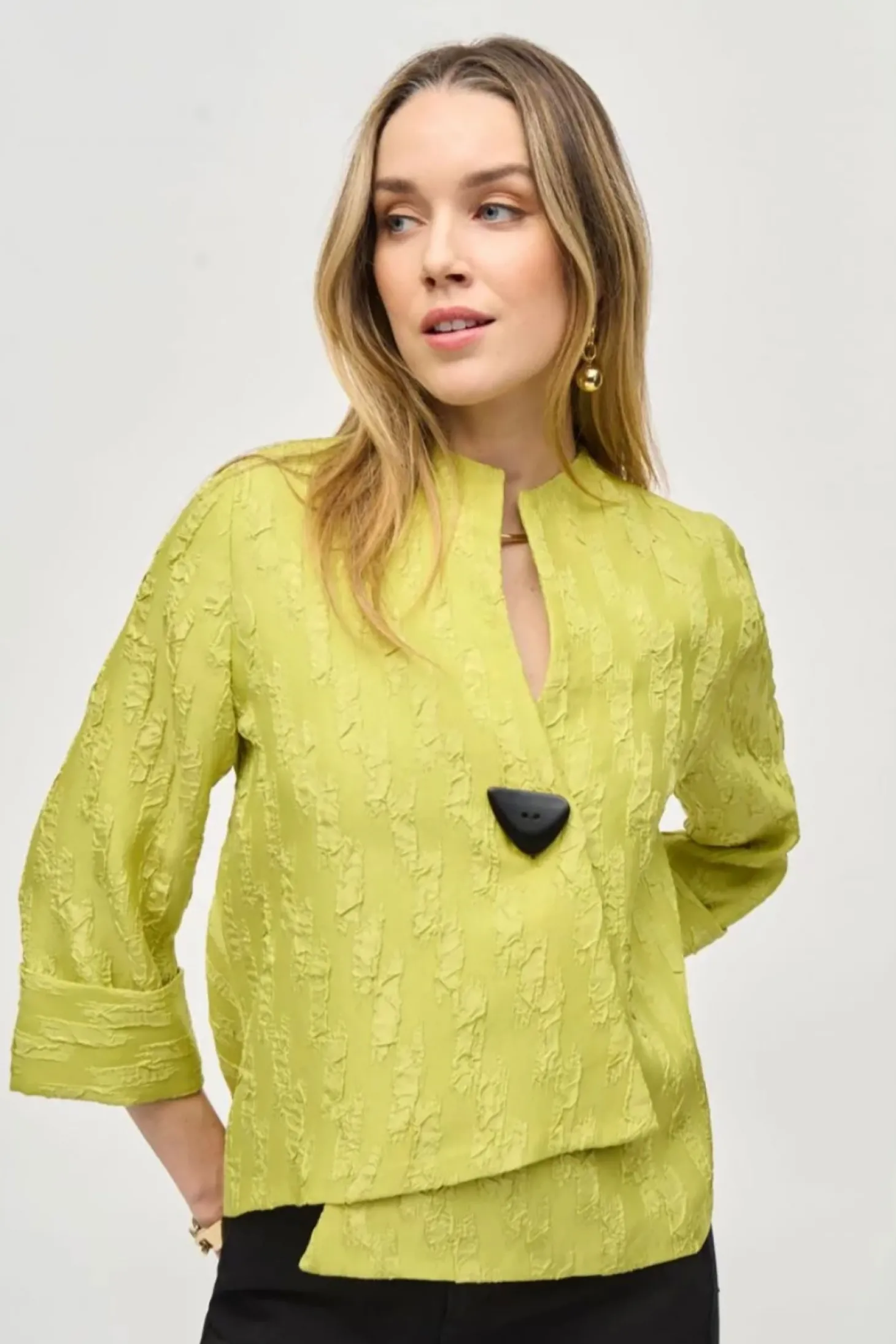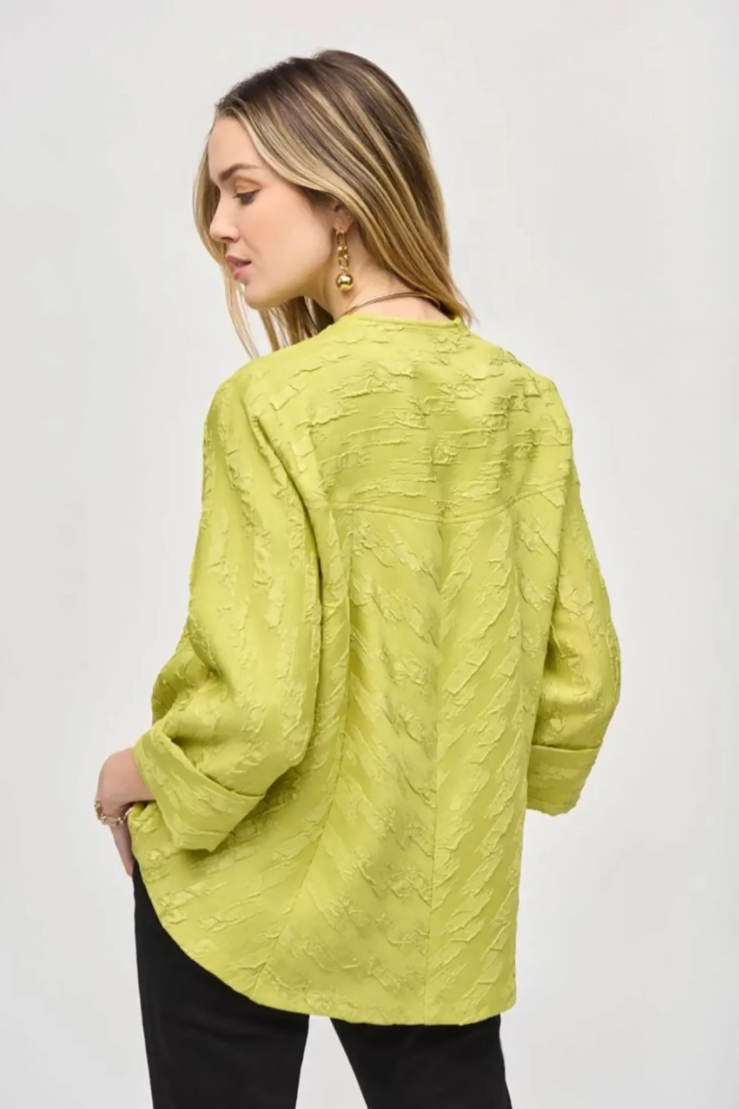 Upgrade your style with the Wasabi Jacquard Swing Jacket. This modern piece blends art and fashion with a chic crew neck, three-quarter cuffed sleeves, and a statement button closure for a polished look. Its impeccable design also includes a yoke and bias panels for added flair.