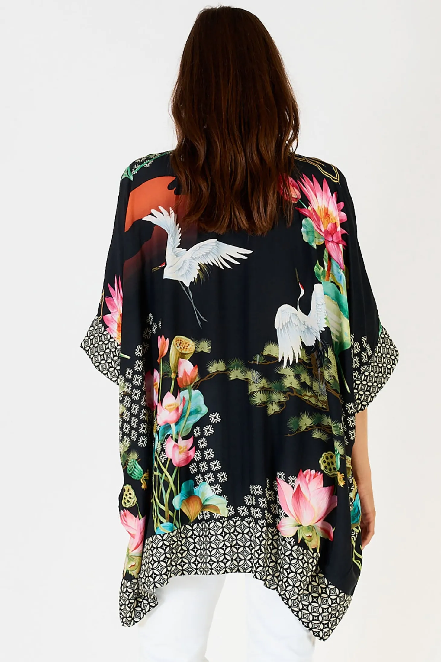 The Yoshiko Kaftan is a versatile and luxurious piece by LulaSoul. Inspired by Japanese designs, it features an elegant crane and lotus flower print with modern geometric trim. Wear it multiple ways as a kimono, shirt, or cover-up for an exclusive and sophisticated look. Embrace the loose fit for added comfort.